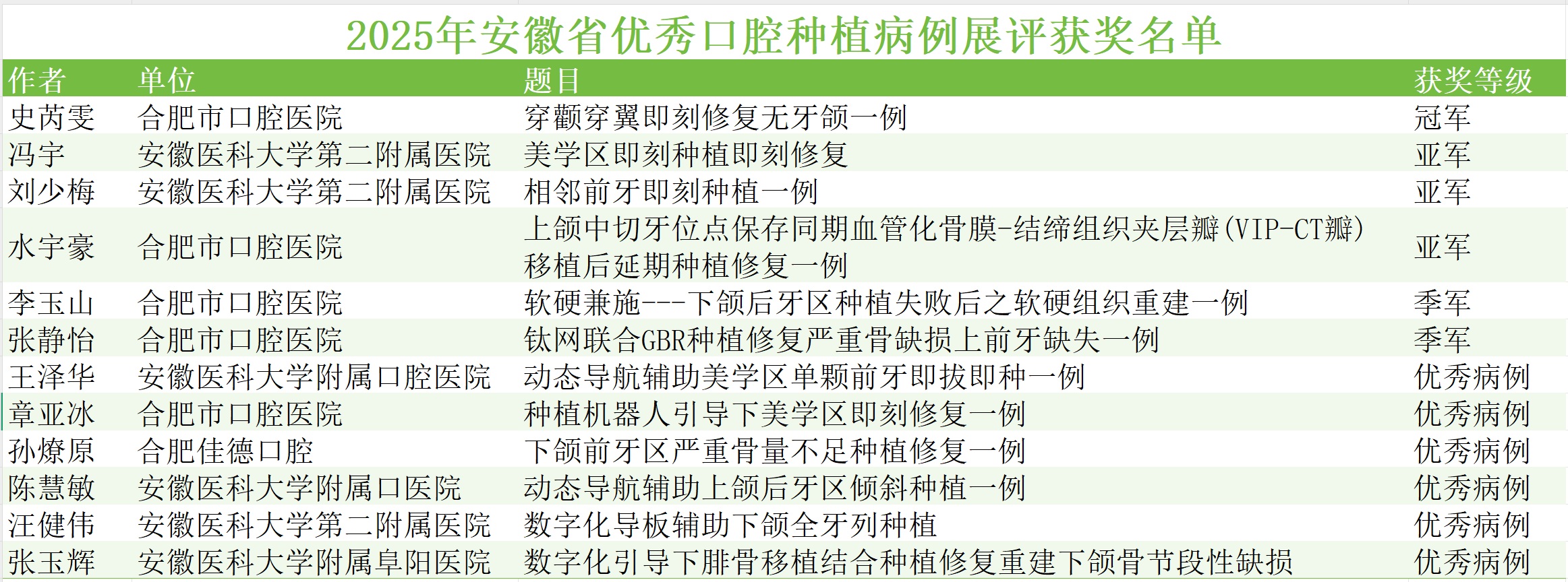 附件:2025年安徽省优秀口腔种植病例展评获奖名单