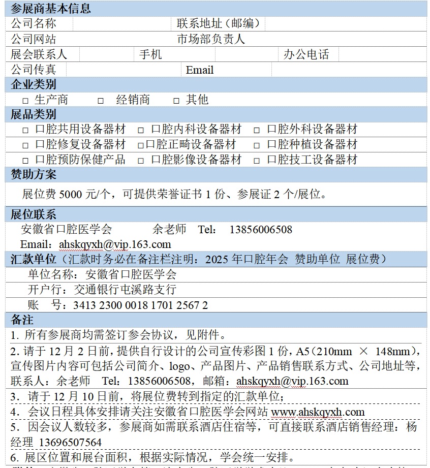 安徽省口腔医学会第9次全省口腔医学学术会议(2025年年会)赞助商邀请函